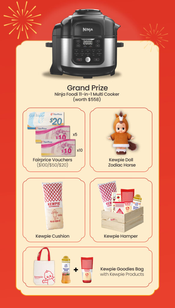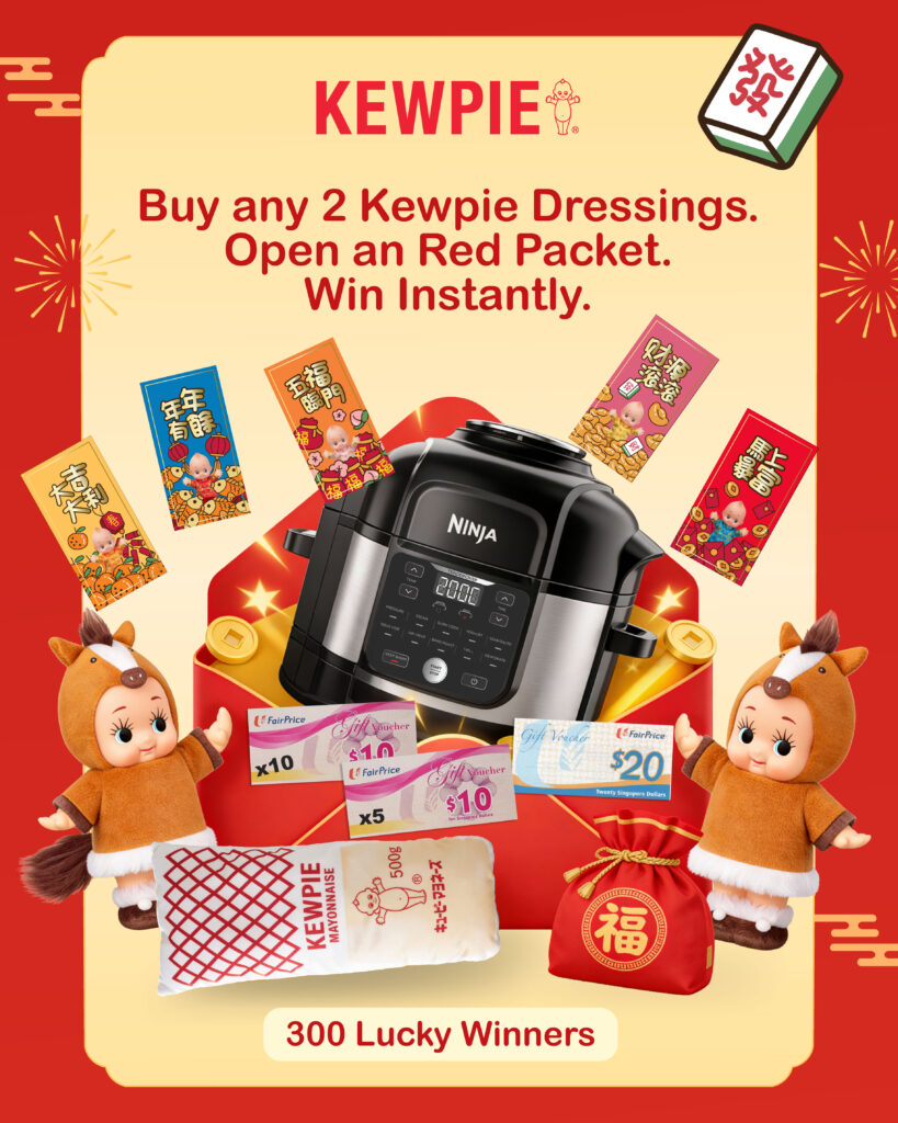 Buy any 2 Kewpie dressings (210ml & above), redeem 1 set of red packet at the Customer Service Counter, and open it immediately to see if you win.