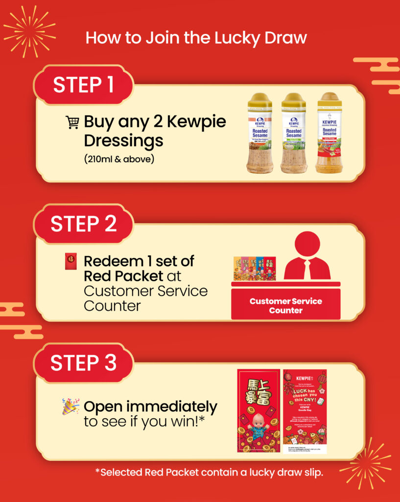 Buy any 2 Kewpie Roasted Sesame Dressings (210ml & above) and redeem 1 set of red packet at the Customer Service Counter. Some red packet contains a lucky draw slip, do open them and check it out!